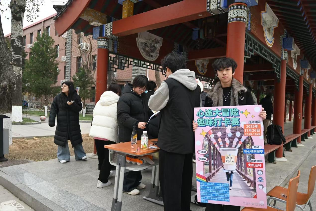 为深入贯彻落实心理健康教育工作要求,切实关注学生心理健康状态,缓解学业压力与生活焦虑,培育积极向上的心理品质,营造温暖包容的校园心理氛围,文法与管理学院以心理关怀为核心,联合院自律委员会于2025年11月26日12:20-14:00在校园内开展“心途大冒险・趣味打卡赛”心理系列活动,吸引全院学生积极参与,活动取得良好成效。